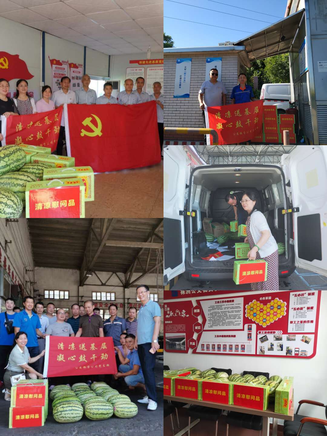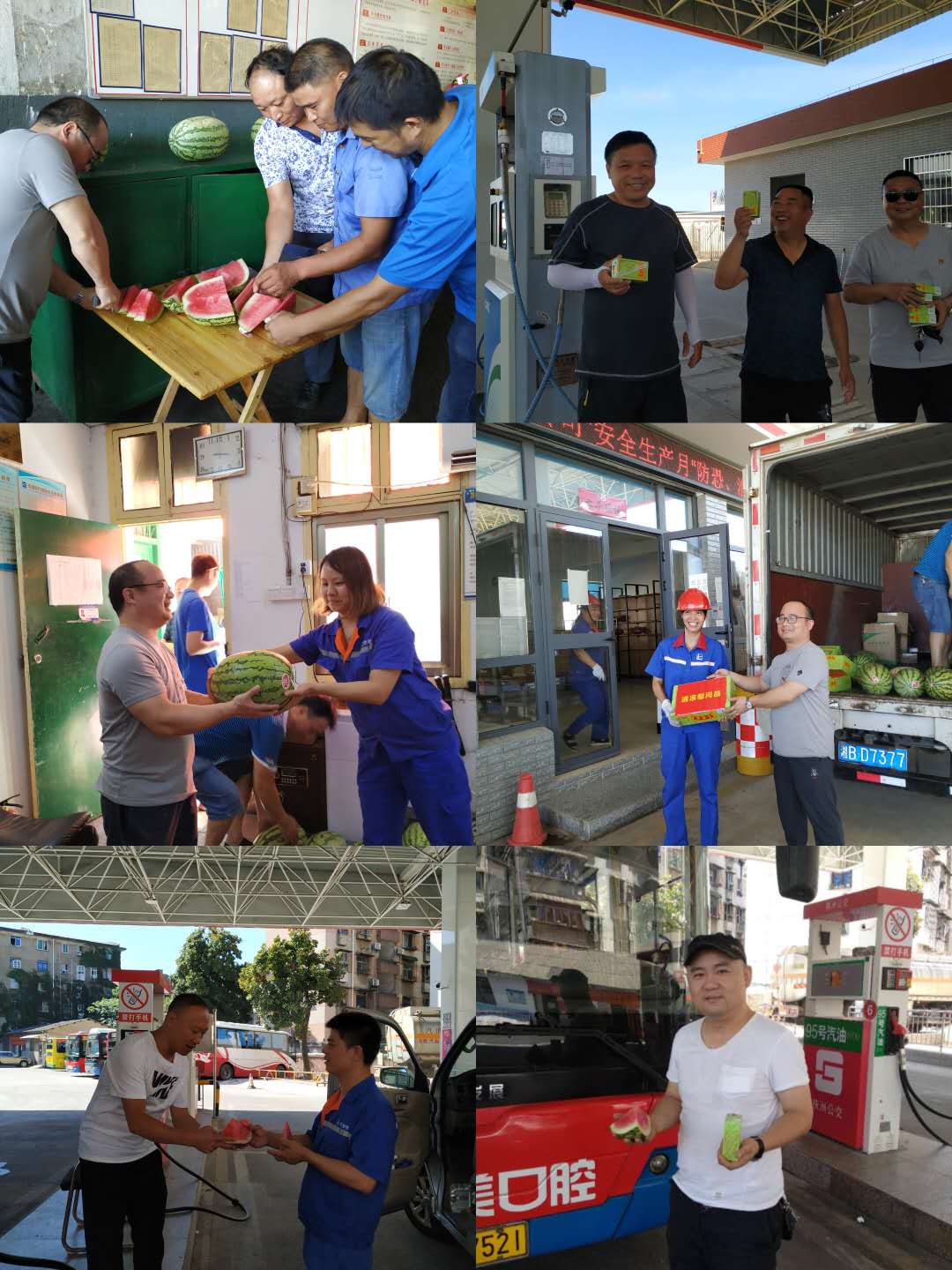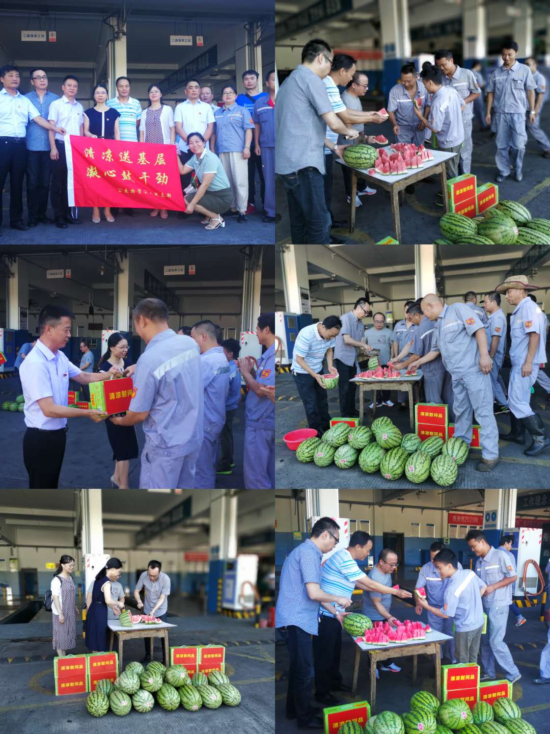 早上8點(diǎn)20分,天高云淡,強(qiáng)烈的陽(yáng)光照射在發(fā)展修理廠的前坪,每個(gè)人都感受到了秋老虎的威力。在發(fā)展公司修理廠、物資公司發(fā)展倉(cāng)庫(kù)、河西撬式油站內(nèi),物資公司班子成員正忙著切西瓜,總公司副總經(jīng)理陳小玲、副總經(jīng)理謝星帶著關(guān)切之情,將一箱箱清涼慰問(wèn)品送到送到辛勤工作的員工手上,并以聲聲殷切關(guān)懷鼓勵(lì)為堅(jiān)守崗位的后勤人點(diǎn)贊鼓勁。