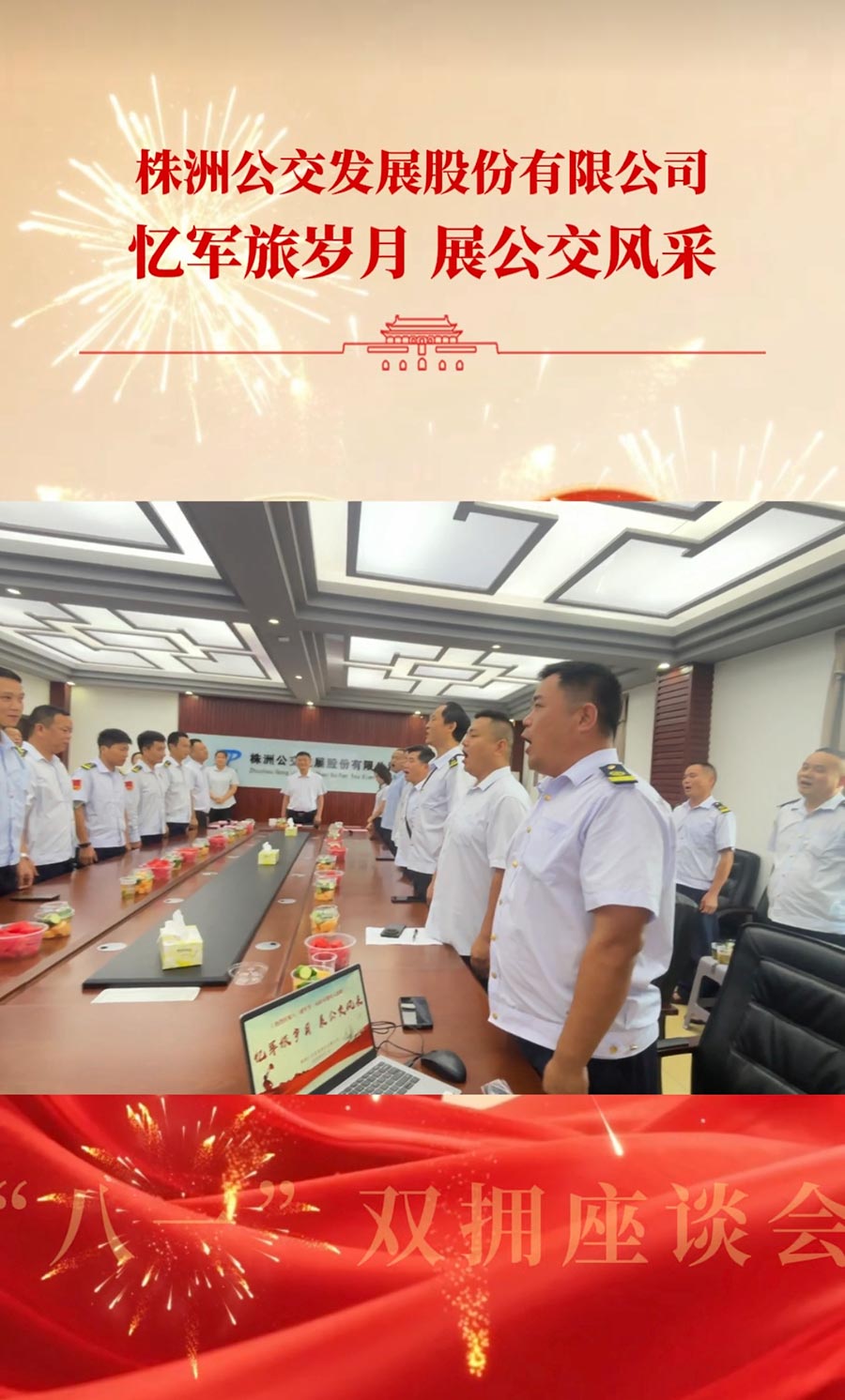 8月1日,公交發(fā)展公司開展"憶軍旅歲月 展公交風采"雙擁座談會。公司黨總支書記、董事長朱建新,黨總支副書記、工會主席王瑩,副總經(jīng)理唐偉以及30名退役軍人參加座談會。