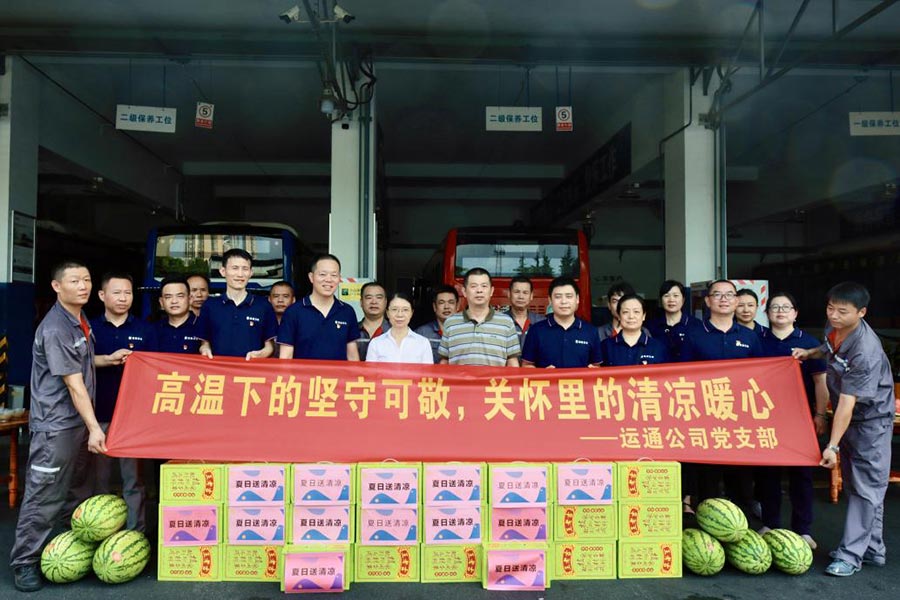 烈日炎炎,熱浪滾滾。近期,集團黨委副書記、工會主席陳小玲,集團副總經(jīng)理黃治峰與運通公司領(lǐng)導班子一行來到運通公司維修車間,為堅守在崗位上的一線修理工送去西瓜、王老吉等防暑降溫物資,將集團的關(guān)懷與敬意傳遞到每一位員工心中。