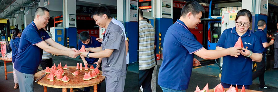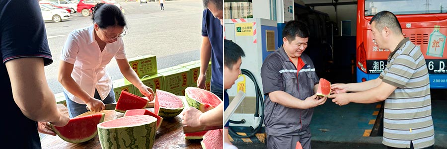 各位領(lǐng)導與修理工們親切交談,詳細詢問高溫作業(yè)下的防暑保障措施落實情況。他們反復叮囑大家,要合理安排工時,勞逸結(jié)合,時刻把身體健康和作業(yè)安全放在首位。隨后,領(lǐng)導們親手將清涼的西瓜和暖胃的綠豆粥送到員工手中,一句句關(guān)切的話語、一份份貼心的物資,驅(qū)散了夏日的燥熱,讓大家倍感溫暖。